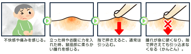 症状は、立ち上がった場合や腹圧を加えた場合に足の付け根部分がふくらみ、不快感や痛みが発生します。ふくらみが硬くなって強い痛みを生じた後、腸がはまり込み壊死する(組織が腐る)と緊急手術が必要になります。
